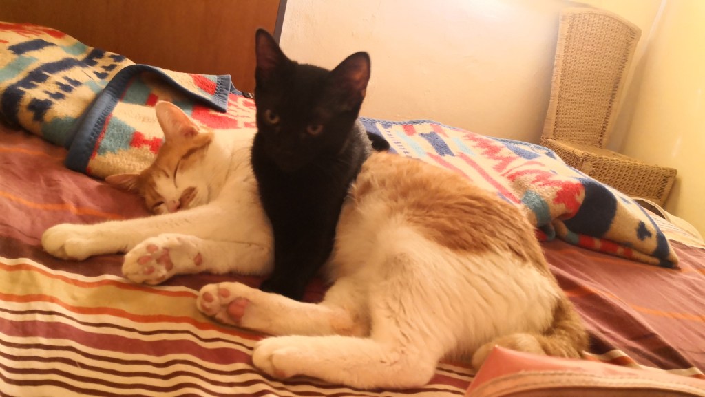 Com que ja us vaig comentar la setmana passada que les mascotes són part de la família us deixo de nou amb una imatge del Safrà fent la migdiada i el Sugus intentant despertar-lo.